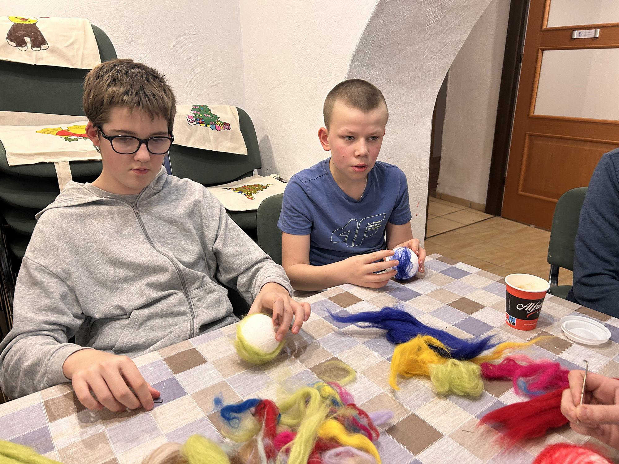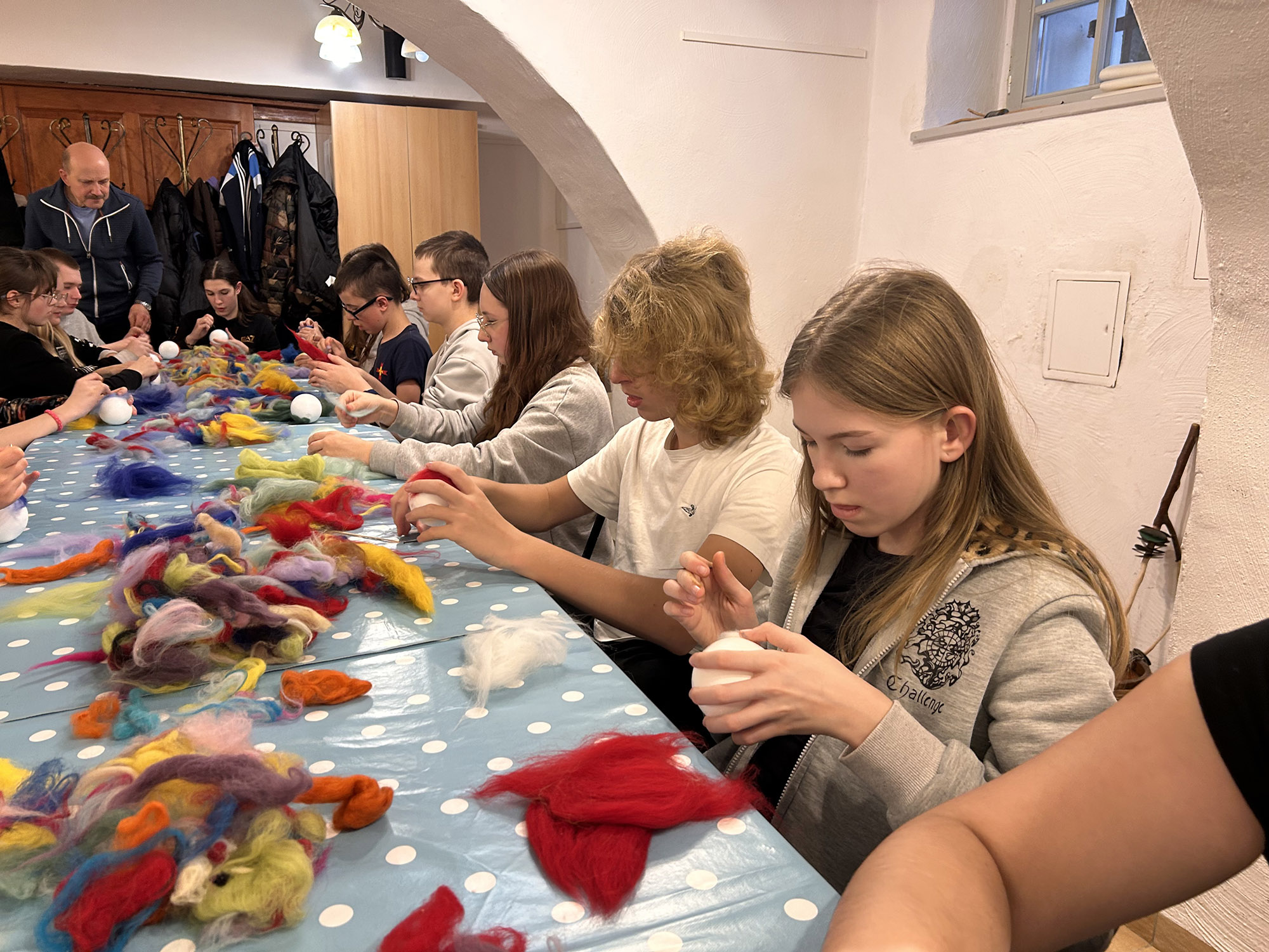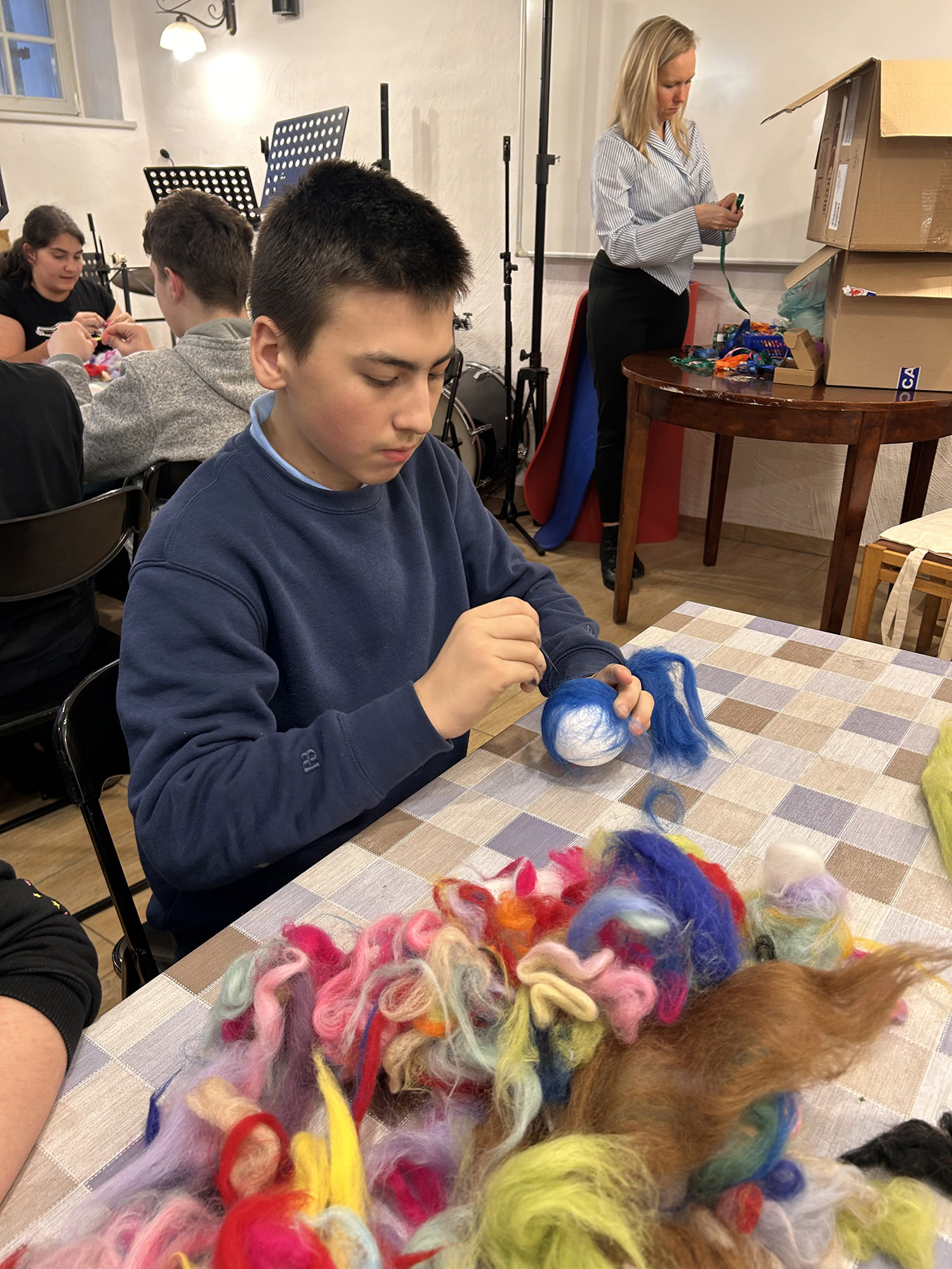 Następnie udaliśmy się do Muzeum Piśmiennictwa i Muzyki Kaszubsko-Pomorskiej w Wejherowie, gdzie uczniowie wzięli udział w warsztatach artystycznych. Wykonywali bombki metodą filcowania na sucho oraz ręcznie malowane torby z motywami świątecznymi.
