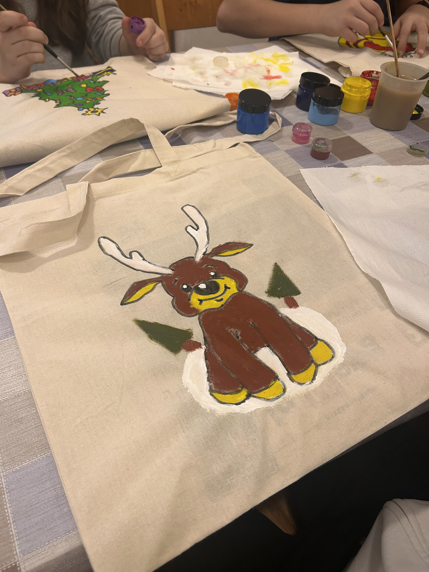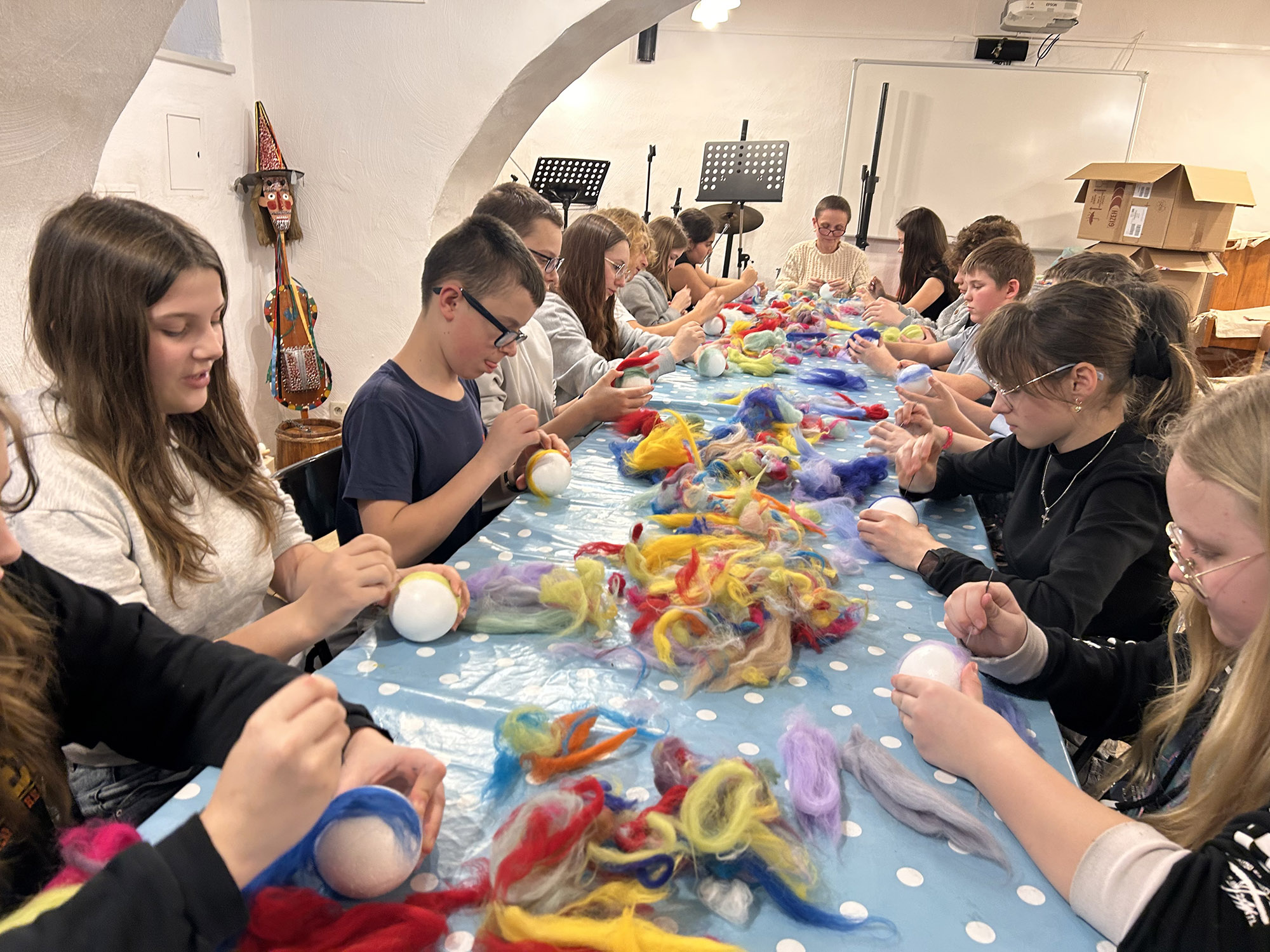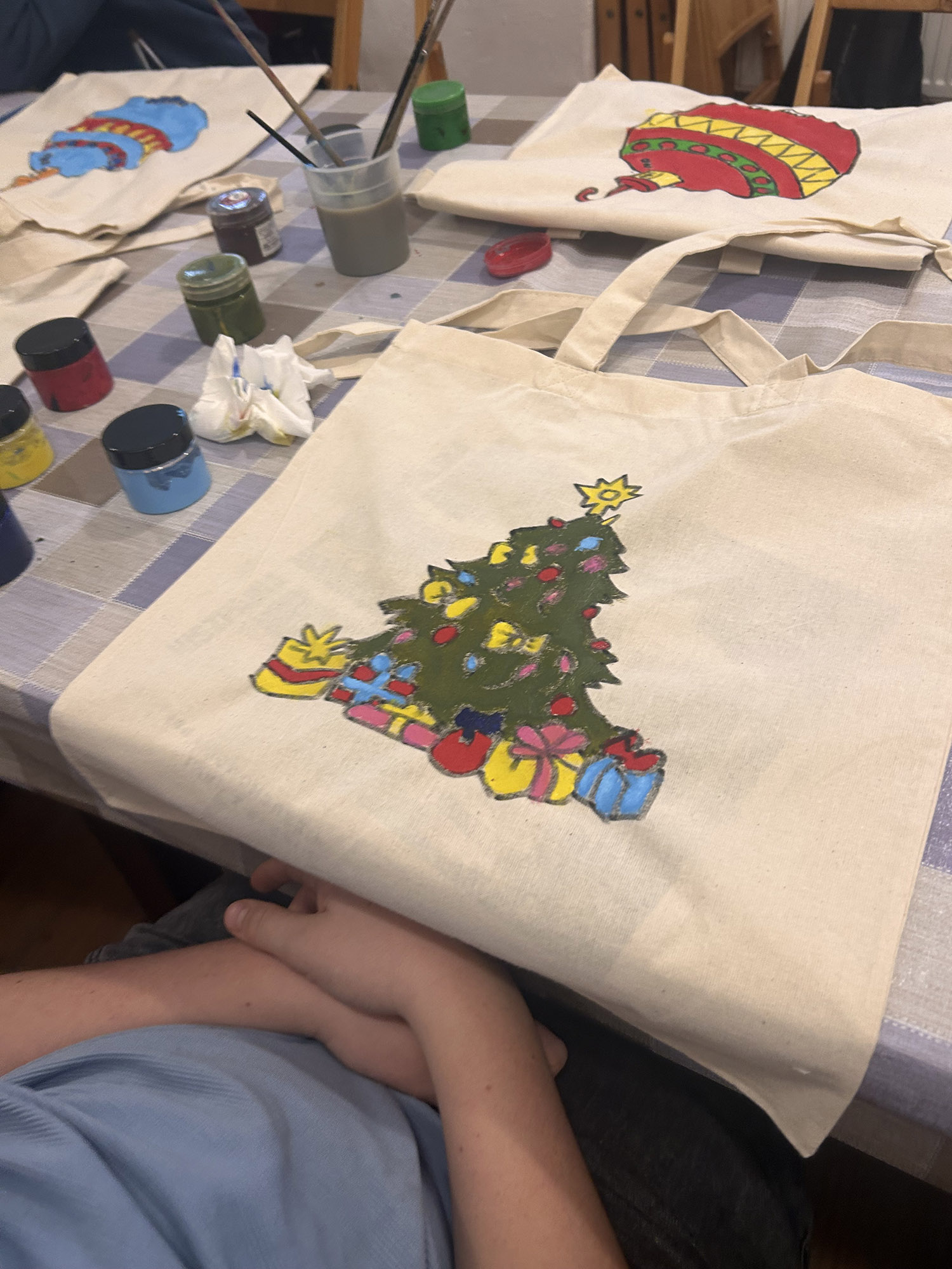Następnie udaliśmy się do Muzeum Piśmiennictwa i Muzyki Kaszubsko-Pomorskiej w Wejherowie, gdzie uczniowie wzięli udział w warsztatach artystycznych. Wykonywali bombki metodą filcowania na sucho oraz ręcznie malowane torby z motywami świątecznymi.