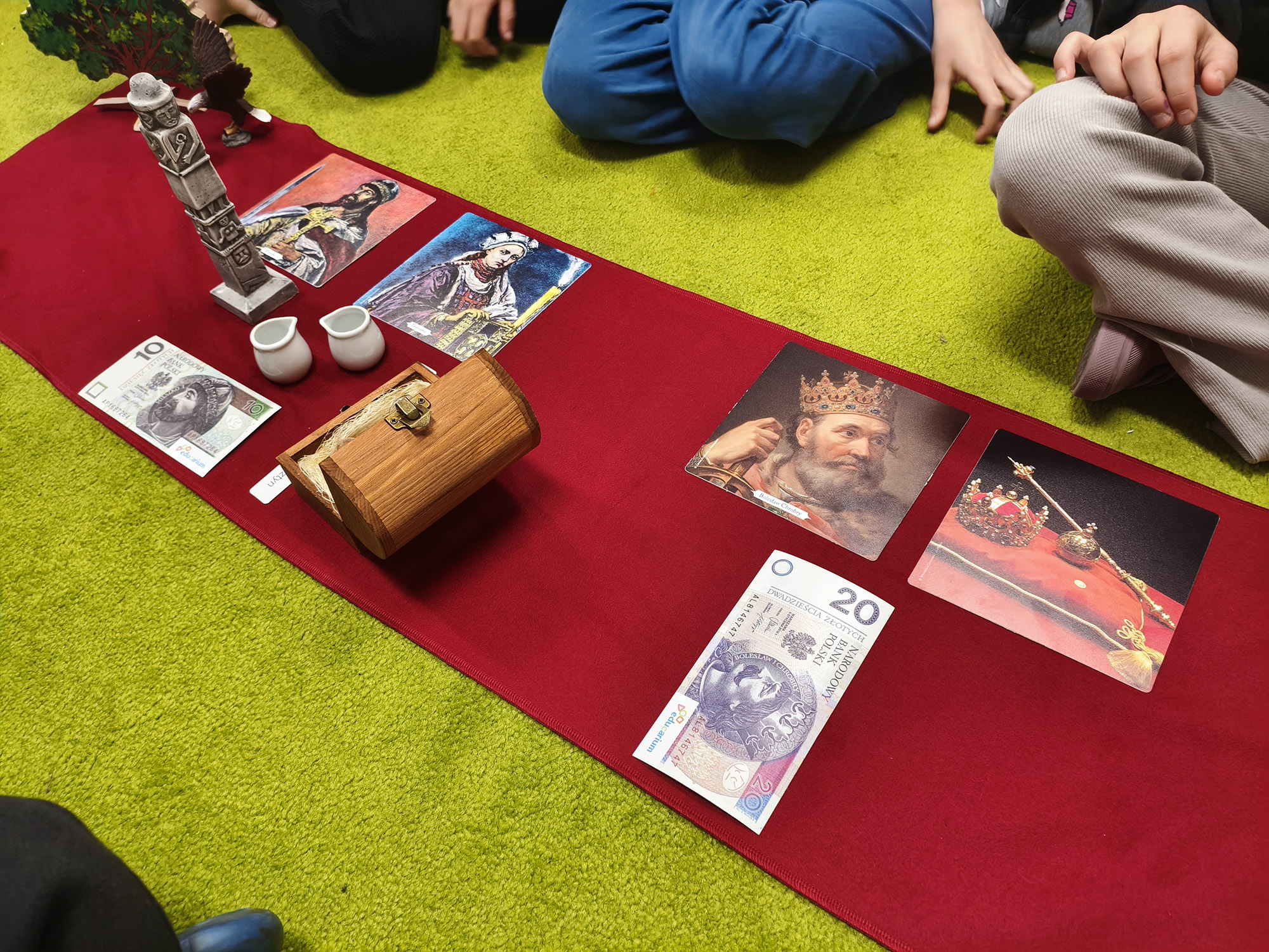 Podczas zajęć dzieci korzystały z klasowego „Skarbca Polskiego” – specjalnego kufra z materiałami dydaktycznymi przygotowanymi do nauki historii. Zgromadzone w nim pomoce pozwoliły uczniom w ciekawy i angażujący sposób przybliżyć realia dawnych czasów oraz lepiej zrozumieć wydarzenia związane z narodzinami państwa polskiego.